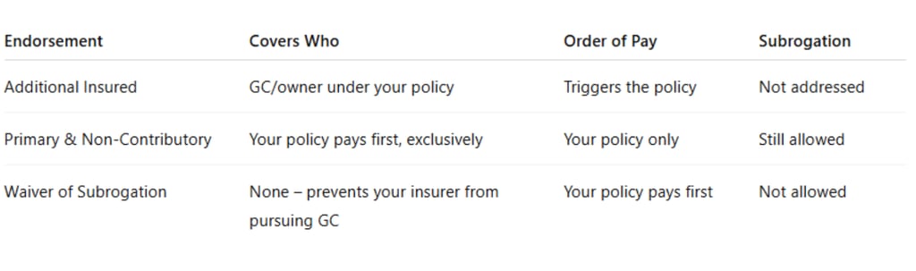 Additional Insured vs. Waiver of Subrogation vs. Primary & Non‑Contributory
